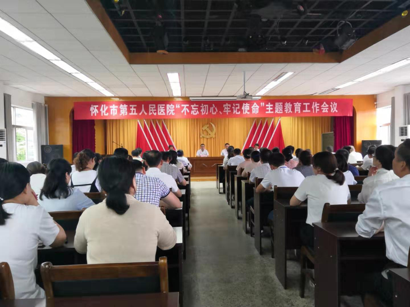 9月18日下午,怀化市第五人民医院召开“不忘初心、牢记使命”主题教育工作会议。市卫健委“不忘初心、牢记使命”主题教育第三指导组尹德荣、曾祥荣出席会议,并作指导讲话,党委书记戴北鸿作了工作讲话,党委副书记、院长张胜军主持会议,医院班子成员、全院党员、职能部门负责人、临床科室主任及护士长参加会议。