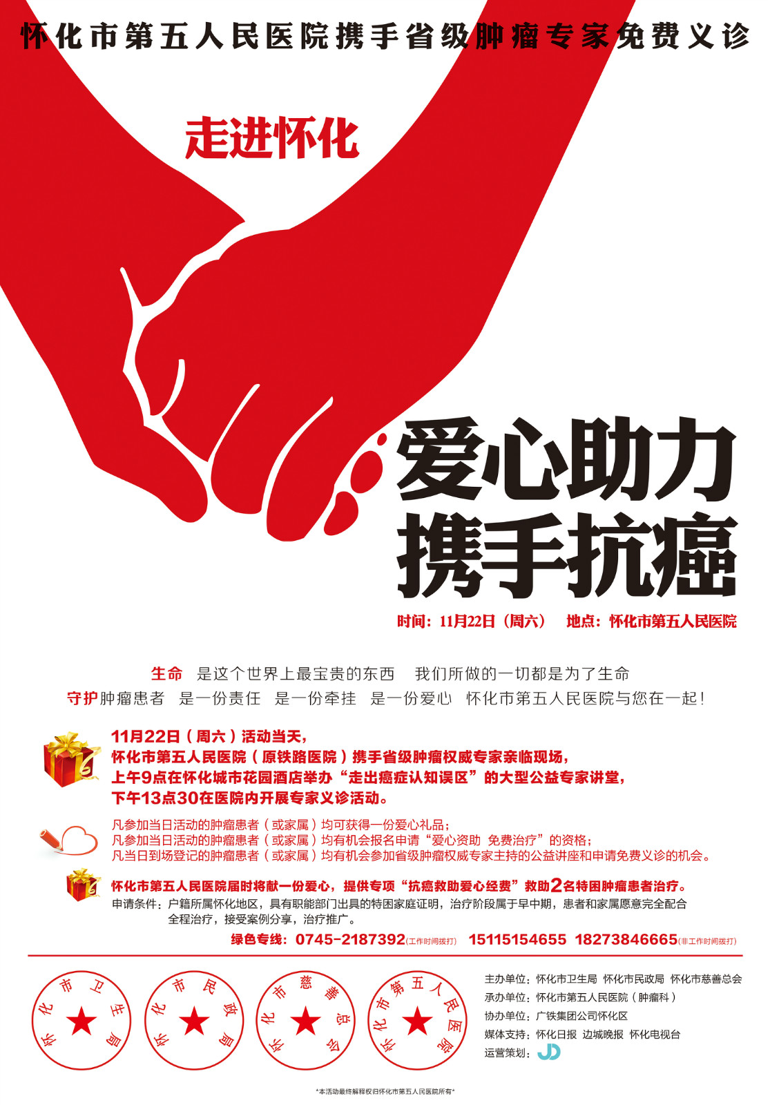 救助治疗申请:凡参加此次活动的肿瘤患者均有机会申请由怀化市第五人民医院提供的3名特困患者救助经费,免费治疗的资格。(申请条件:户籍所属怀化地区,具有职能部门出具的特困家庭证明,治疗阶段属于早中期,患者和家属愿意完全配合全程治疗,接受案例分享,治疗推广。)