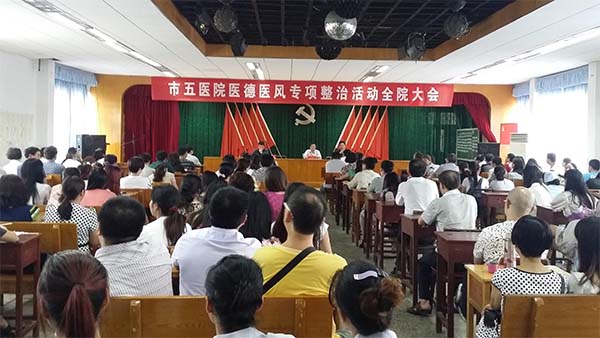 7月8日下午4点,市五医院医德医风专项整治活动全院大会在门诊部四楼会议室举行。会议由院党委书记姚强主持,院长马绍庆就医德医风专项整治活动作重要讲话,院纪委书记祝衡永宣读了《怀化市城区医院医德医风明查暗访情况通报》、《怀化市卫生计生系统医德医风专项整治活动实施方案》和《怀化市第五人民医院医德医风建设整顿初步方案》,来自临床医技科室、机关后勤部门共300余名医务人员参加。